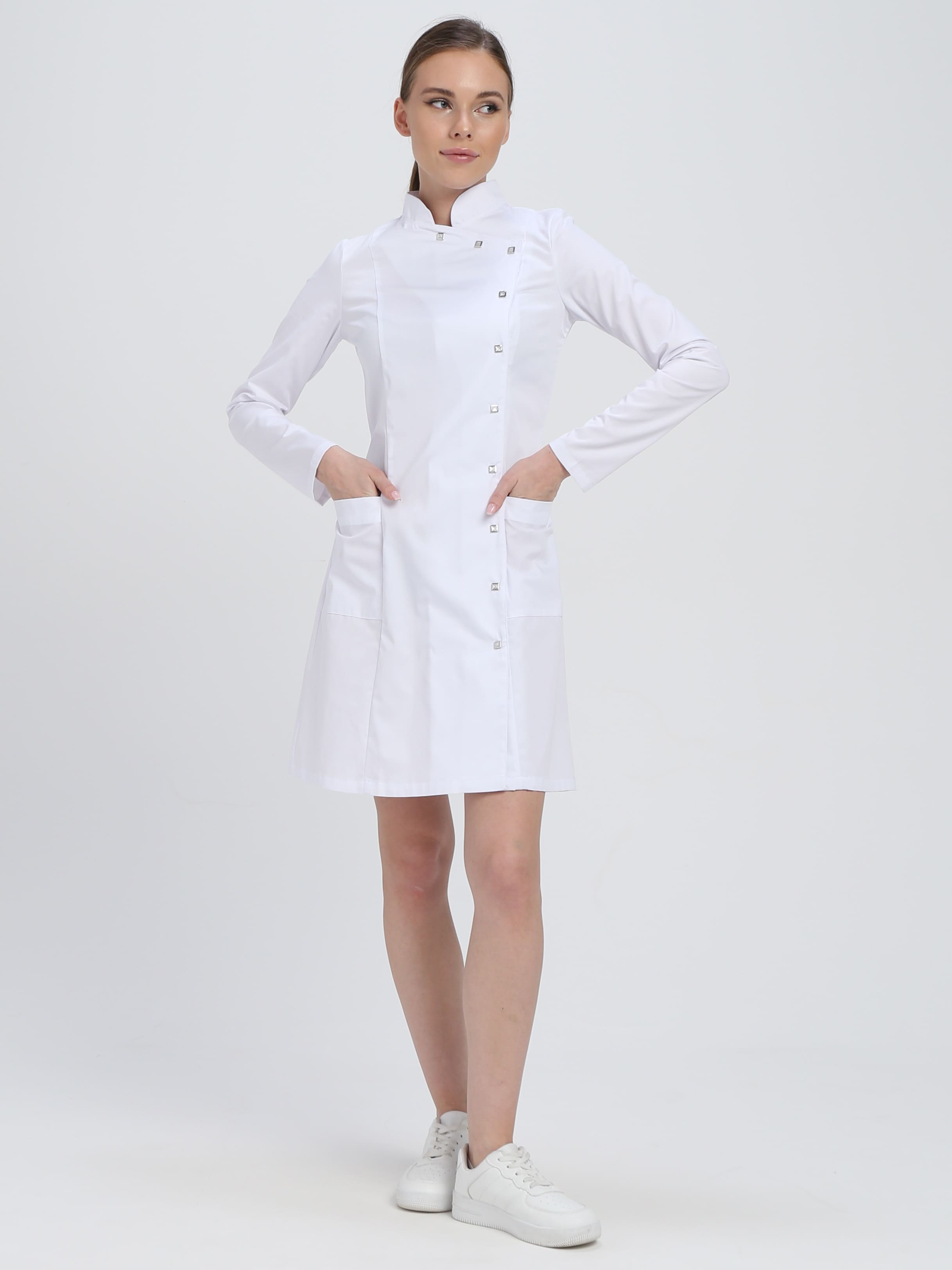 Халат медицинский женский полуприлегающего силуэта, укороченный, длиной выше колена с оригинальной асимметричной бортовой застежкой на металлические кнопки. Полочка и спинка с рельефными швами, что сделает вашу фигуру визуально стройнее. Рукав втачной, прямой, длинный. Воротник-стойка с закругленными концами сделает ваш образ более женственным. Хлястики в боковых швах позволят вам регулировать свободу прилегания по линии талии. Ткань очень пластична и легка в уходе, обеспечивает комфорт в течение дня.